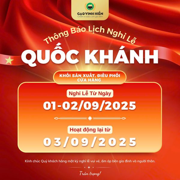 Nhân dịp kỷ niệm ngày Quốc Khánh 2/9, Gạo Vinh Hiển xin trân trọng gửi lời tri ân sâu sắc đến Quý khách hàng và Quý đối tác đã luôn đồng hành, tin tưởng và ủng hộ công ty trong suốt thời gian qua. Đây là dịp để toàn thể đất nước cùng nhau nhìn lại chặng đường lịch sử hào hùng, tự hào về truyền thống dân tộc, đồng thời cũng là khoảng thời gian để mỗi người tạm gác lại công việc, sum vầy bên gia đình và tận hưởng những phút giây vui vẻ, trọn vẹn yêu thương.